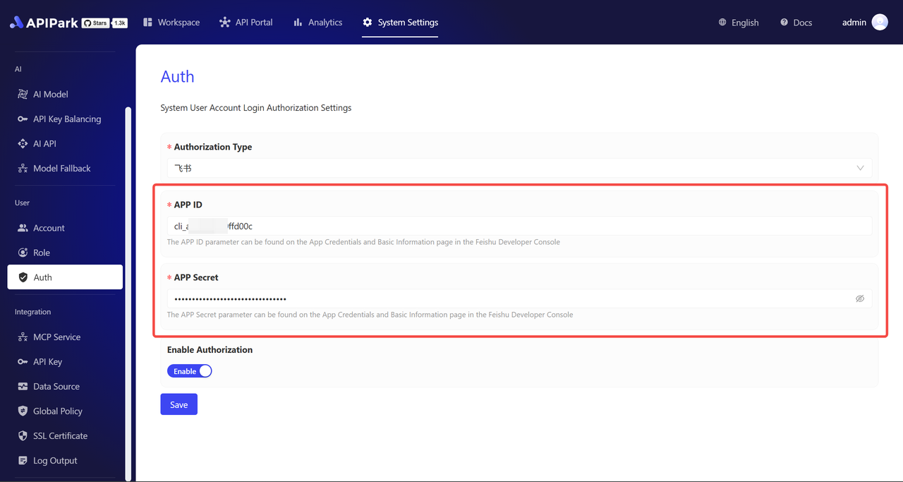 - Enter the APP ID and APP Secret into the corresponding fields on the APIPark Account Authorization Configuration page.