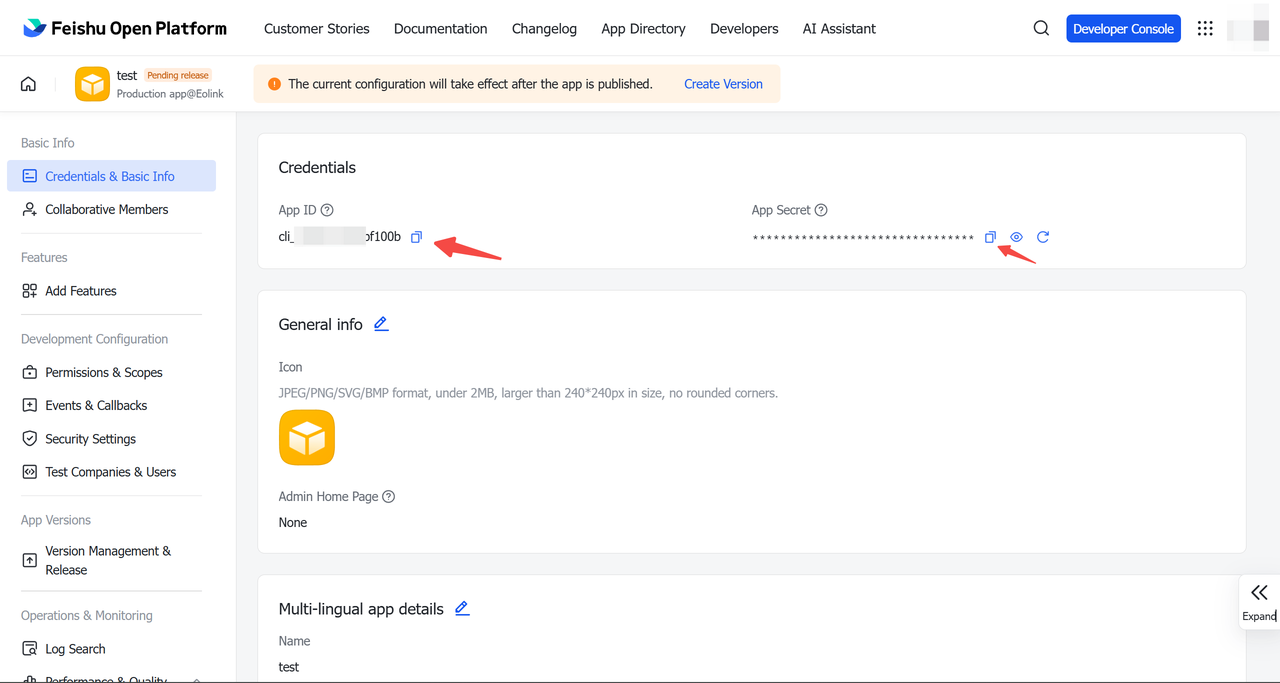 - Log in to the Feishu Developer Console and navigate to the "Application Credentials & Basic Information" page.